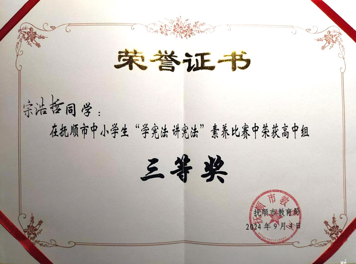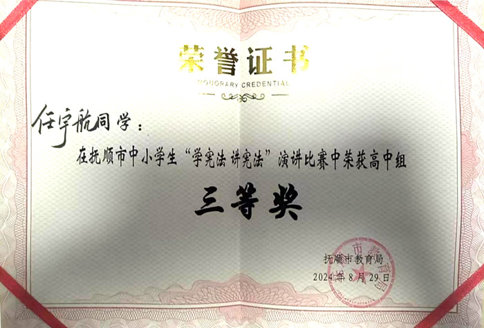 在抚顺市中小学生“学宪法讲宪法”演讲比赛中,我校学生积极参与,展现风采。其中,任宇航同学凭借扎实的法律知识储备和出色的演讲表现,在众多选手中脱颖而出,荣获高中组三等奖 !